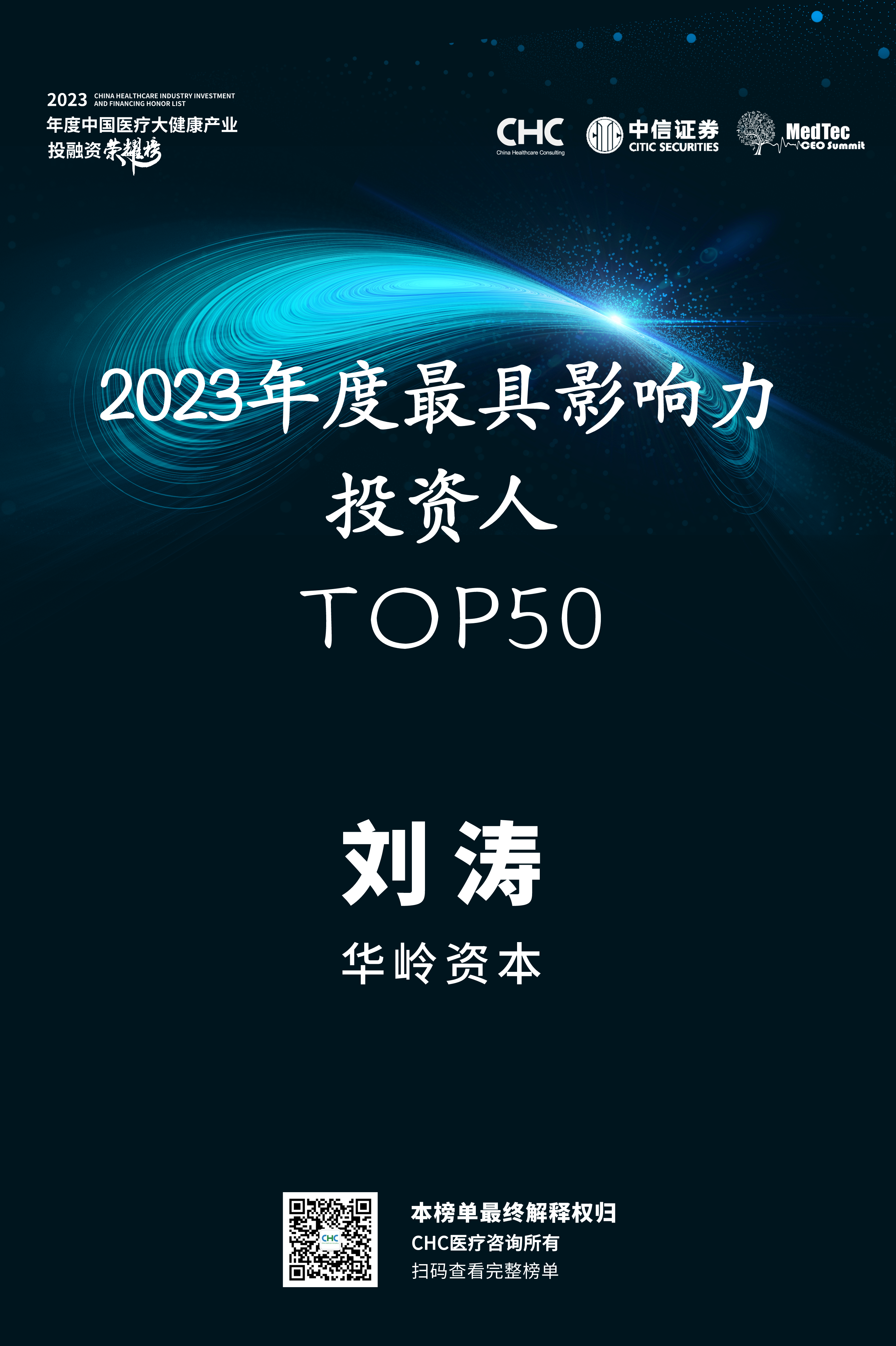 (中國)2024年5月15日,由CHC醫(yī)療咨詢攜手中信證券共同推出的「2023年度中國醫(yī)療大健康產(chǎn)業(yè)投融資榮耀榜」正式發(fā)布,華嶺資本董事長劉濤獲“2023年度最具影響力投資人TOP50”殊榮,這也是劉濤先生再度蟬聯(lián)此項榮譽。